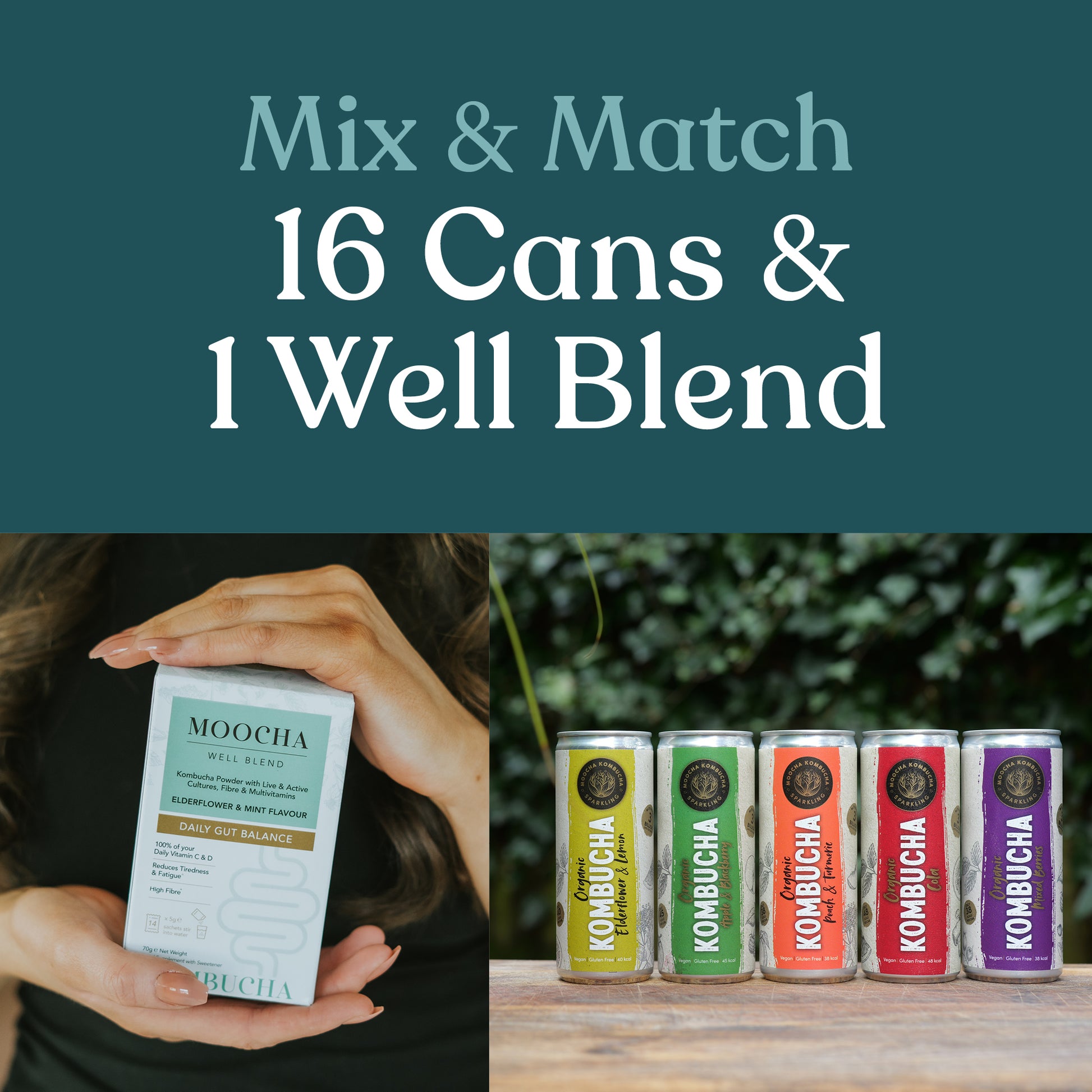 Mix & Match: 16 cans of Moocha Kombucha cans and 1 box of Moocha Well Blend