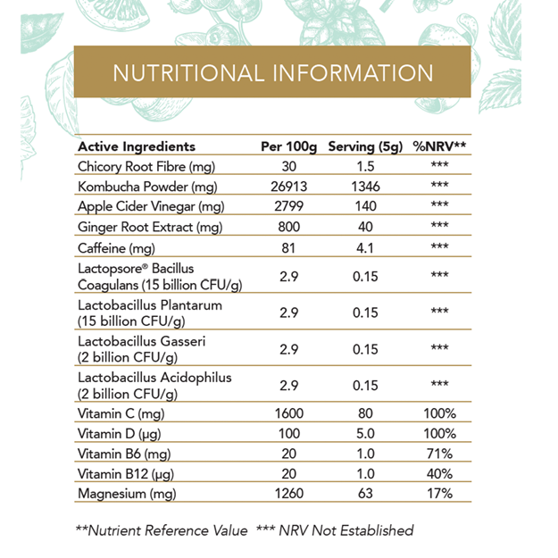 Each 5g sachet combines fermented green tea kombucha culture with 4 probiotic strains, prebiotic fibre, apple cider vinegar, and essential vitamins for effortless gut health support.